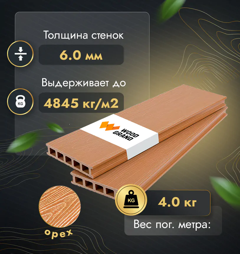 Наша террасная доска из МПК выдерживает до 3318 кг/м2, влагостойкая, не требует ухода.